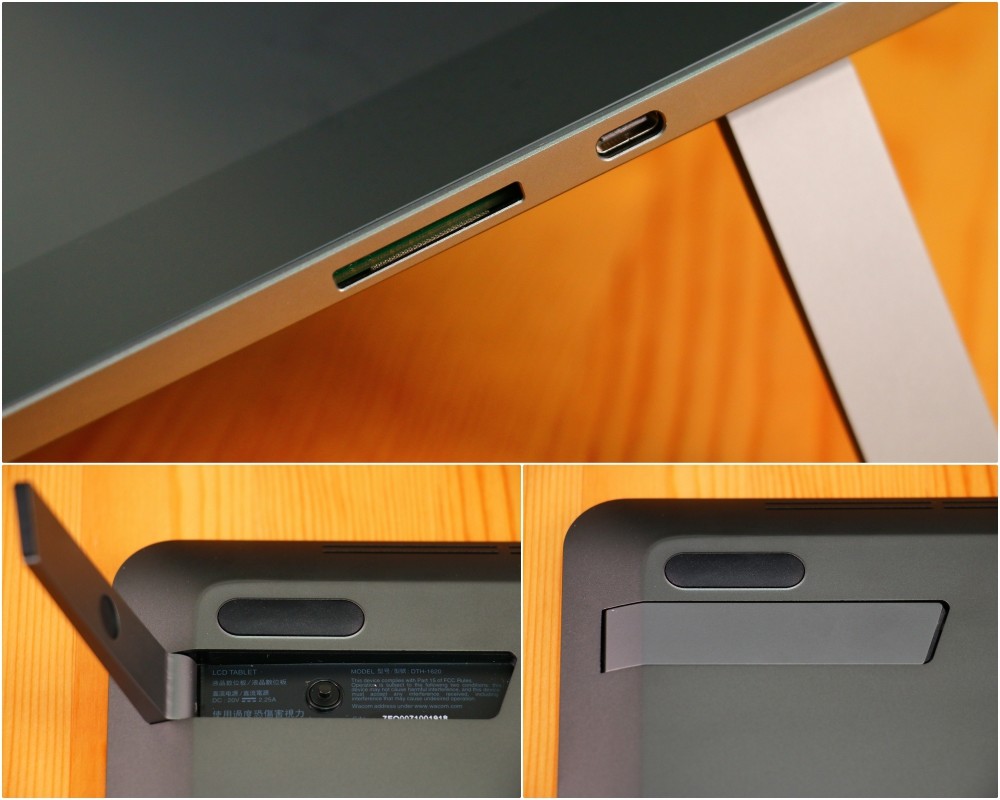 重點來了!除了上方的電源鍵之外,右側還提供方便的 SD 卡插槽,完全就是有考慮到攝影的修圖工作者(淚)。兩側分別設計了 USB Type-C 的連接埠,只要透過盒內附傳輸線,就能把 Wacom Cintiq Pro 16 連接起來,完美地呈現 4K 的效果囉!連結的部分後面會跟大家介紹一下。