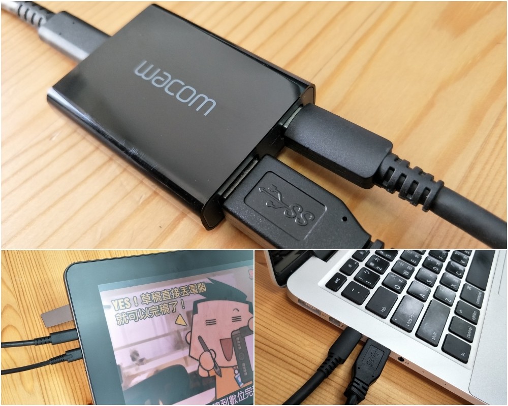 當然像我自己目前沒有最新版 Macbook Pro,所以並沒有支援 USB Type-C 顯示,我的 Macbook 能支援的只有 Mini DisplayPort 啦!別擔心,這個時候就把內附的 Wacom Link 轉接器拿出來,把 USB Type-C 接到左側插孔,再把右側的 USB Type-A 和 Mini Display 安插好,這樣就搞定了。