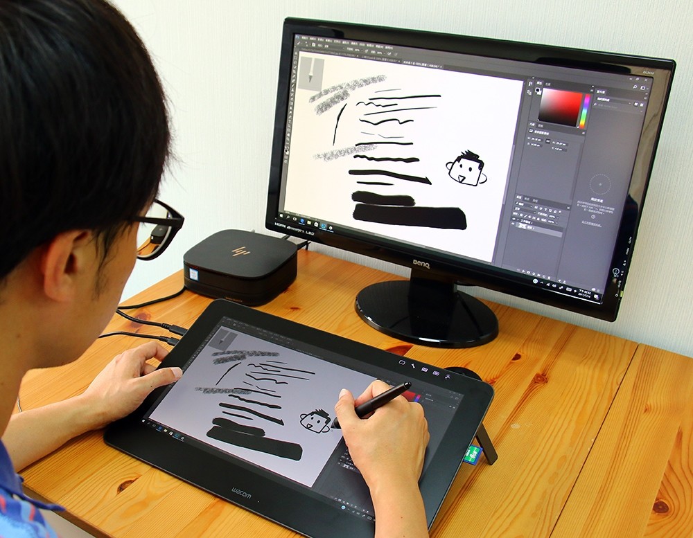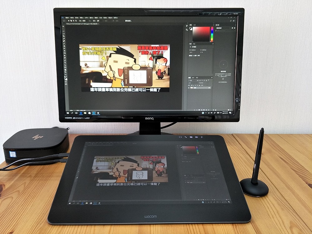 顯示器畫面的部分就看使用習慣囉!有的人會喜歡兩邊同步顯示,有的人卻比較喜歡延伸螢幕的做法,把繪圖軟體的畫面直接在繪圖板主畫面上呈現,其他像是收信、上網或其他應用程式的畫面,就在第二顯示器上,我自己是比較喜歡第二種做法啦(因為桌面超亂,至少繪圖板是乾淨的)