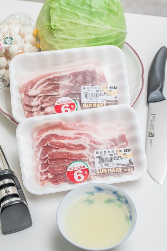 食材:高湯(熊喵這次使用的是雞高湯,約1公升,視砂鍋大小彈性調整),高麗菜三分之二顆,豬五花肉兩至三盒、美白菇半包、蔥段