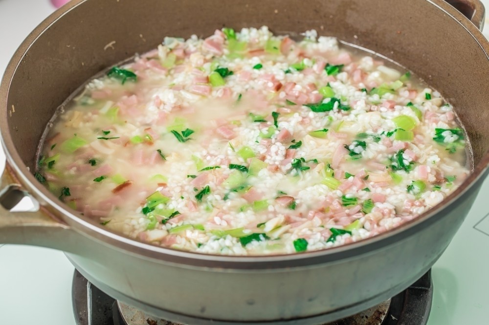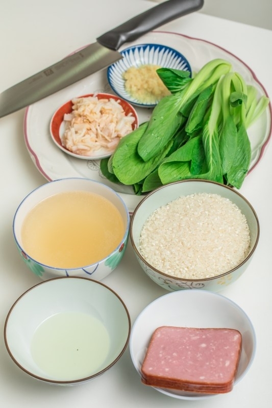 食材:白米兩杯、雞高湯兩杯、火腿一塊約手掌心大小、青江菜5~8根