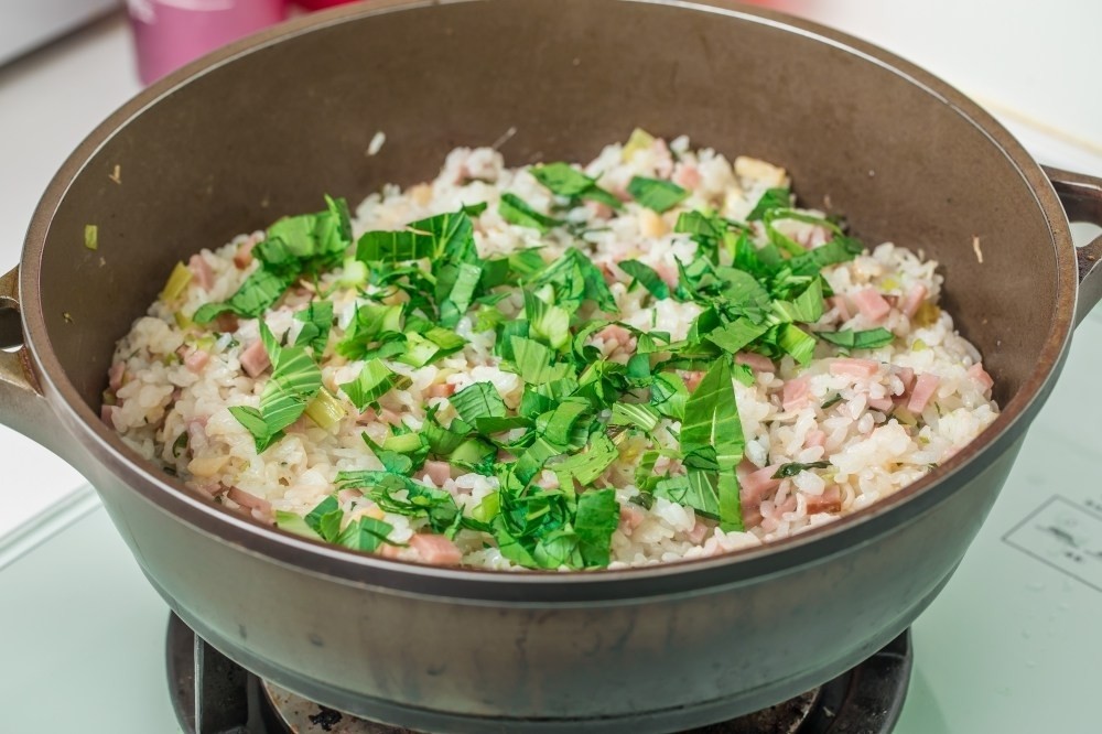 8.起鍋前確認米的熟度,菜飯的口感一般比較濕軟,如果熟度沒問題,就加入剩下的菜葉稍稍拌炒後關火(這樣葉子比較不會黃黃的,有增色的效果),接著就可以起鍋裝盤囉~