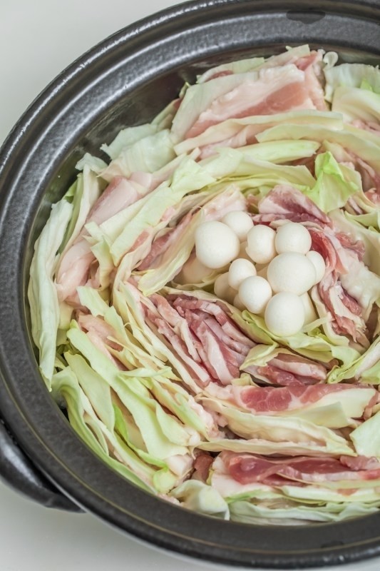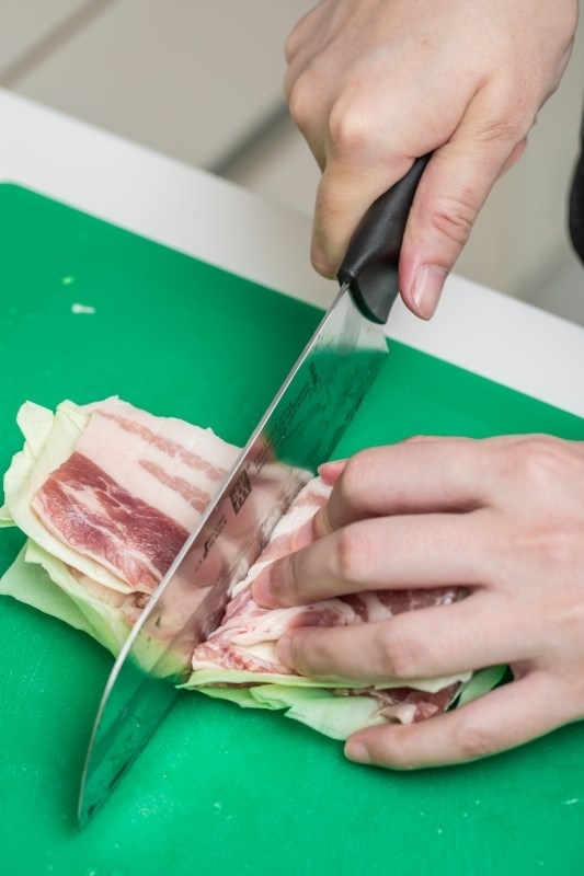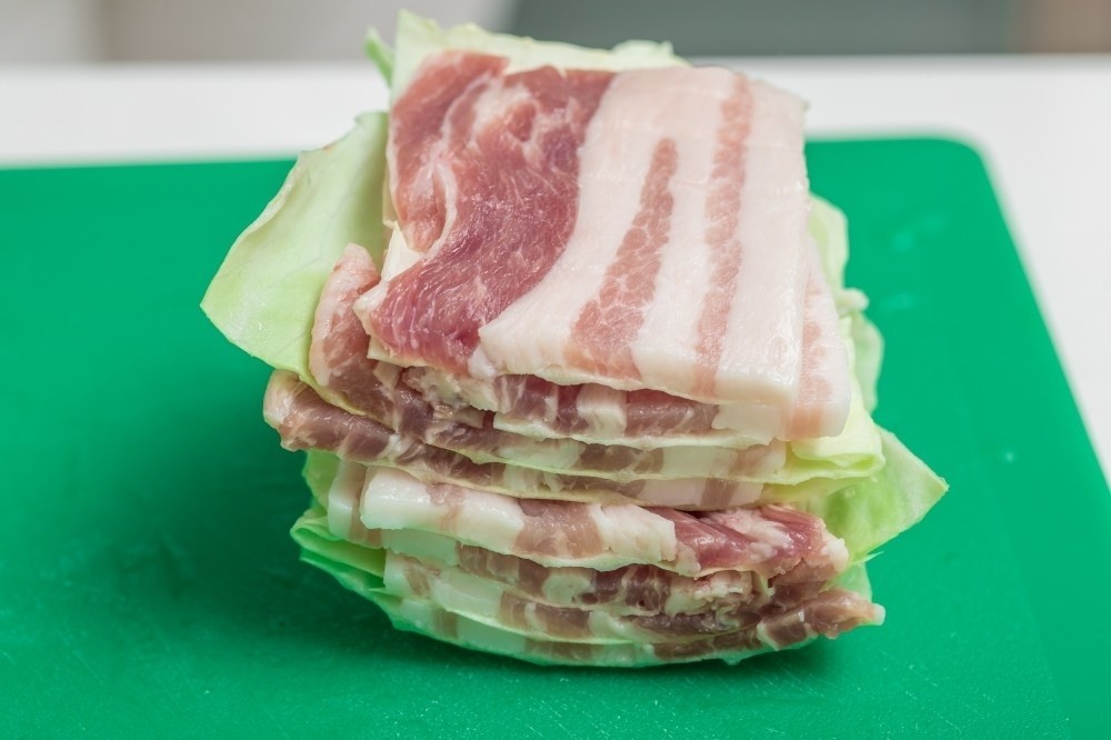 2.接著把高麗菜和豬五花一層一層疊起來,並切成適度的寬度(與砂鍋高度差不多)