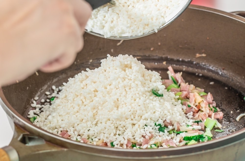 6.加入洗淨的米,與鍋中的料拌炒均勻。