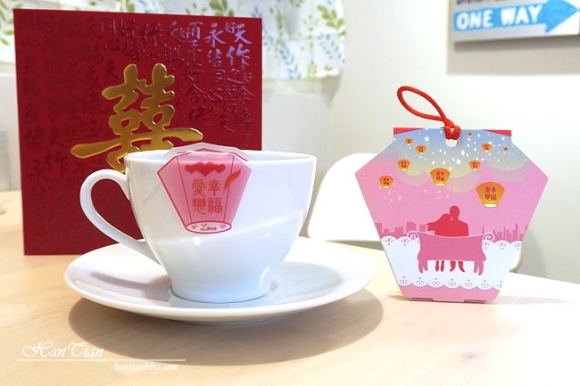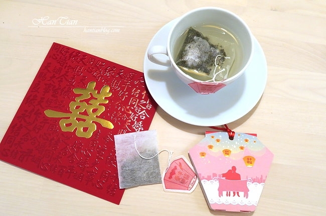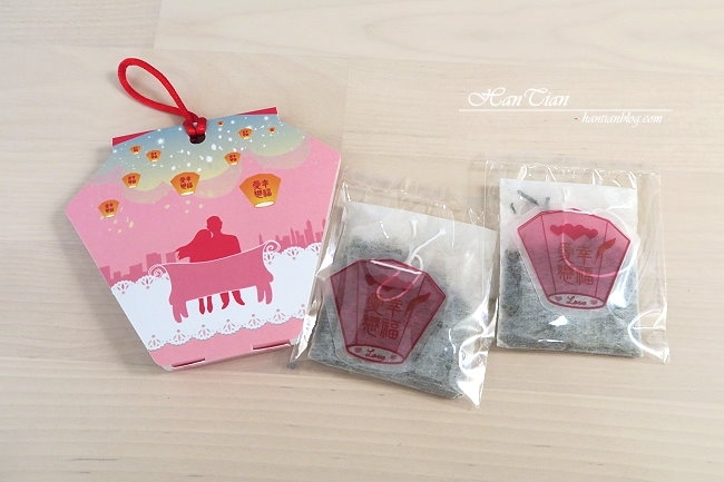 可以自己設計造型,在天燈茶包包裝印上新人的名字