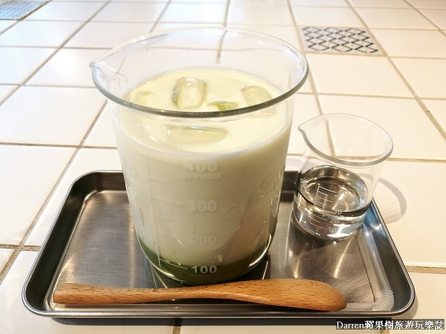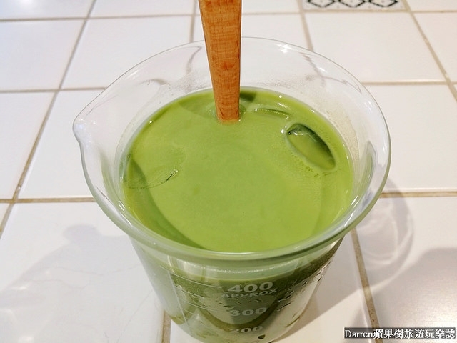用燒杯來裝飲料非常有梗,抹茶牛奶端上來是無糖,在旁邊還有小燒杯裝糖漿,可以依自己喜好斟酌添加