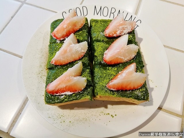 厚片吐司上面有抹茶醬和抹茶粉放上草莓加持,厚片有先切成一小塊,吃起來很方便不會很乾抹茶醬超加分