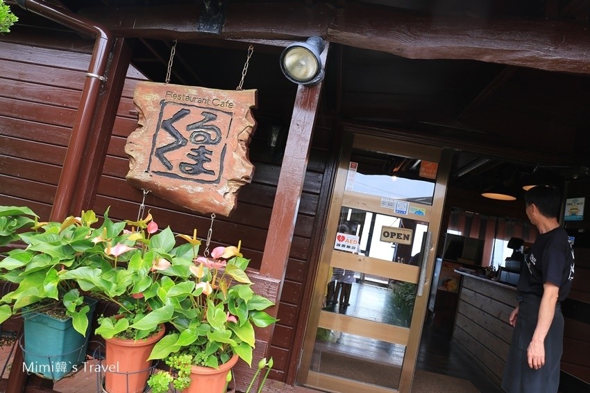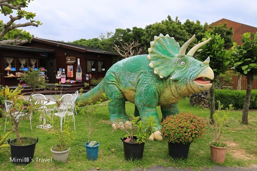 噗噗,說真的 CAFE 薑黃花(カフェくるくま)地點實在有點給他偏僻,不管山下到山上沿路都沒有顯眼的招牌,而且就算開到外面,車都停在門口,還會很懷疑有沒有找錯地方,要不是車上有GPS導航(Map Code:232 562 891*82),再加上這隻巨大的三角龍當門口吉祥物,想吃到這家沖繩美食還真有點難度。