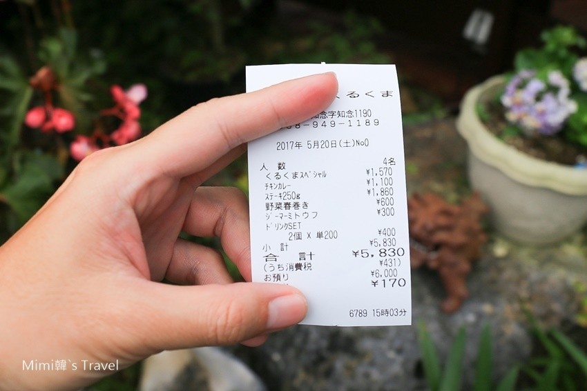 最後結帳稅後是¥5,830,有美食有美景,這家CAFE 薑黃花(カフェくるくま)是這趟來全家人滿意度都很高的沖繩美食,簡單分享囉~