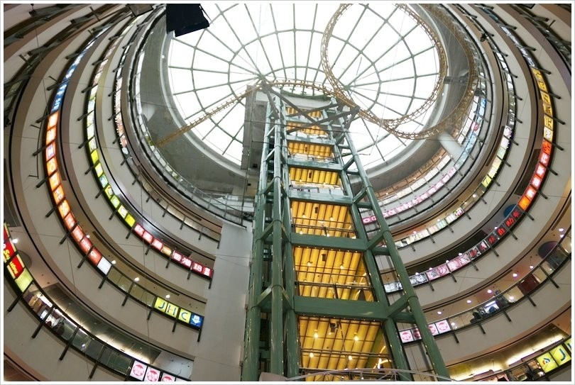 ▼電梯位於正中間,整個商場呈現球型的圓弧設計,看起來採光相當好!定睛一看最頂樓的那個軌道不正是雲霄飛車嗎?原來這裡以前真的有在行駛,只是為了安全考量暫停開放,但其實它還是很安全的,如果買了保險之後還是可以重新營業的!
