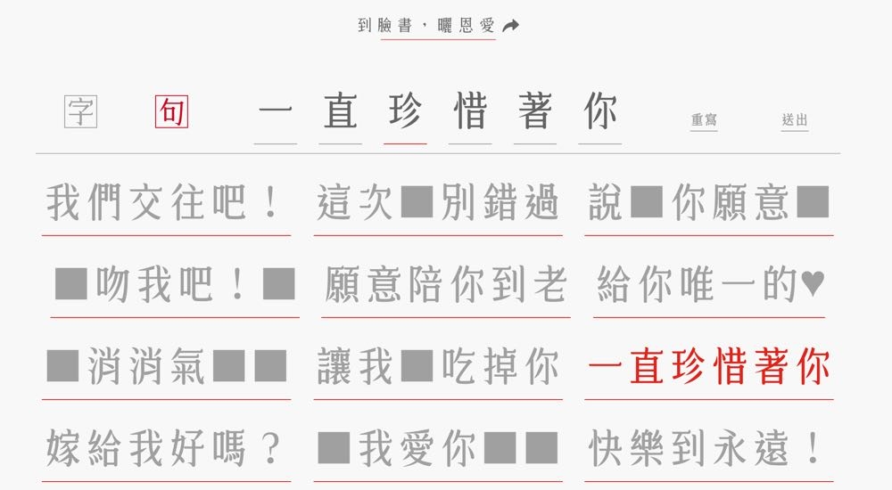 在活動網站上我們可以看到華康提供了六個字的欄位讓朋友們使用,不管是從下方的文字、符號或是直接套用預設的句子,都可以在拼湊出自己想要對另一半說出的話後開始進行設計。在填完送出個人資料後,便能於 8 月 25 日至 29 日至台北信義誠品親自領取巧克力來準備送給親愛的另一半囉!