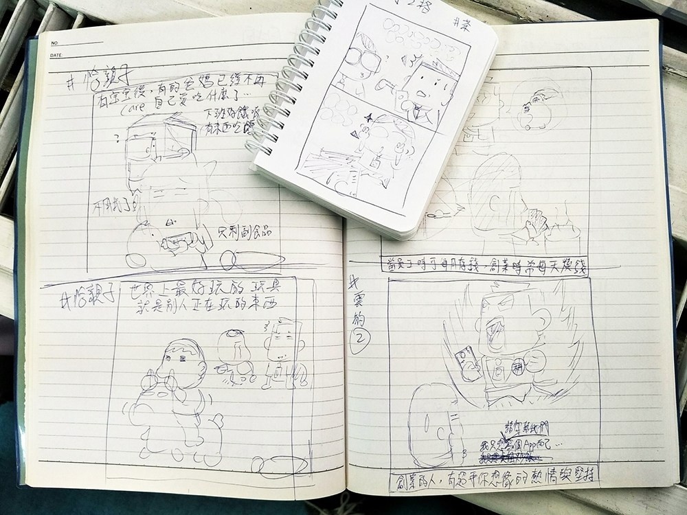 簡單聊一下我這種畫網路漫畫的「工作」,首先,靈感不是隨時都有的,有的時候自己突然有對於生活的體驗、時事新聞或是天外飛來一筆的靈感,就要趕快用文字或圖像把梗記下來,我自己會使用類似 Evernote 或 Dropbox 這樣的雲端工具做儲存,回到家就打開電腦趕緊把這些東西畫出來,這是個很奇妙的工作,也有點像是記者,因為有些東西只要時間過了就沒這麼有趣了,在資訊爆炸的時代,創作也變得很有「即時性」。