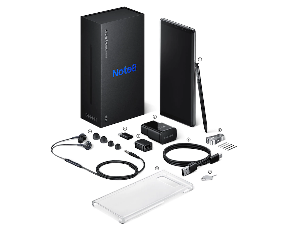 根據稍早三星官方釋出的盒裝內容物一覽表來看,消費者購買後,除了會收到用精緻的盒裝包裝起來的 Note 8 一支外,還會在盒裝內看到 S Pen 筆尖更換器與五支備用筆尖、充電器、microUSB 轉 USB Type-C 轉接器、USB Type-C 轉 Type-A OTG 轉接器、傳輸線、SIM 卡針,以及一條 AKG 線控耳機與兩組備用耳塞。另外,盒裝內還會附贈一個可以完善保護手機的硬質透明保護殼。