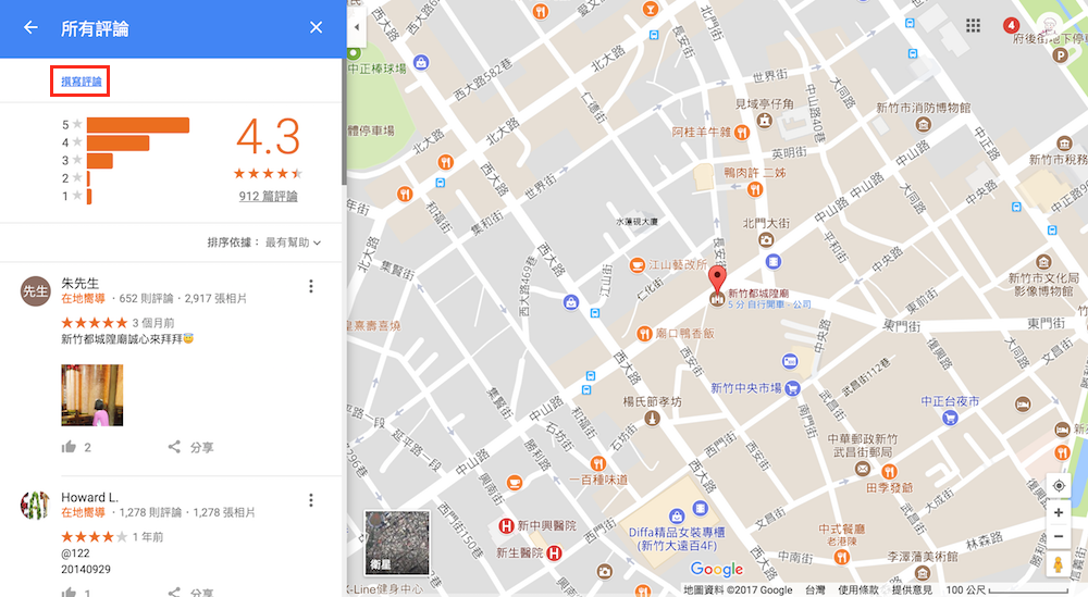 當我們以正確的搜尋到景點之後,請直接點擊星號旁邊的評論按鈕,這時 Google 地圖左側資訊區塊就會切換為評分與評論視窗,接著再點選上方的「撰寫評論」,就能馬上進入景點評分與評論的撰寫頁面囉。