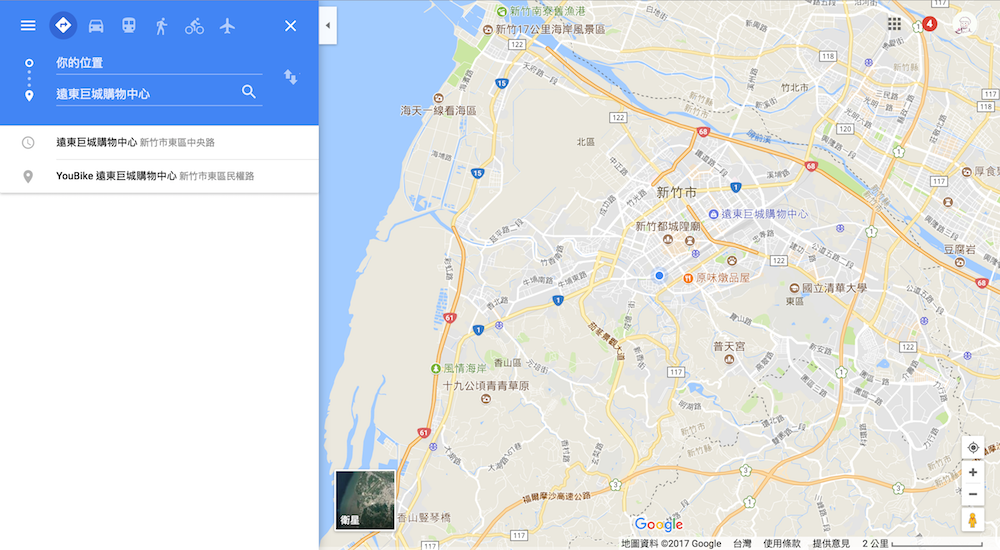 進入 Google 地圖路線規劃頁面後,即可在這兩行搜尋列中輸入目前所在地與目的地名稱或地址,就完成地按步驟了。此外,如果想要交換去程方向,可以點擊最右側的上下箭頭選項,Google 地圖就會自動將所在位置與目的地上下交換,讓地圖規劃能符合用戶目前路徑方向。