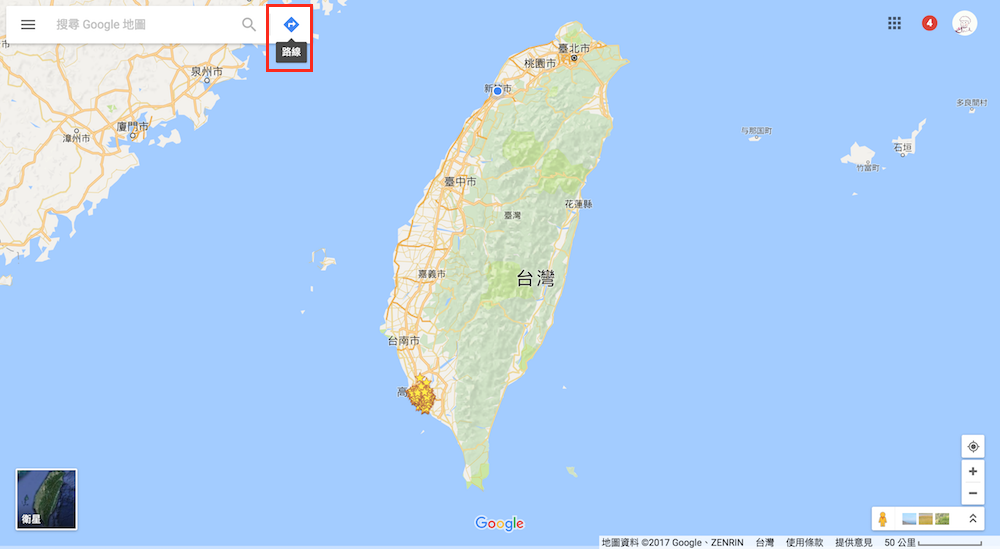 當我們準備規劃行程路線時,首先先請用戶開啟 Google 地圖的頁面,接著直接點擊搜尋列旁邊的「路線」選項,就會立刻進入路線規劃的頁面。