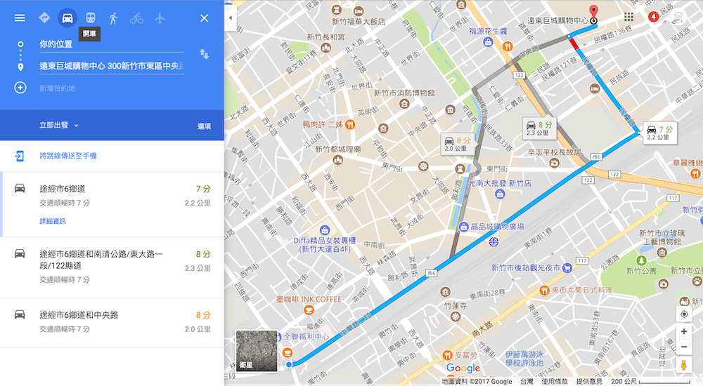 接下來就是關鍵了,當我們將所在位置與目的地名稱或地址都輸入完畢後,這時我們就要來選擇前往該目的地「會使用的交通工具」。最上方的交通工具列,除了最左側的開車之外,還有大眾運輸工具、步行、騎單車以及最右側的搭乘飛機,用戶可以依照目前所使用的交通工具來規劃路線,這樣 Google 地圖就會自動標示出行徑路線。此外,為了避免引導錯誤導致受困的狀況發生,提供一些使用經驗給大家,如果今天所使用的交通工具為機車,建議大家將交通工具設定為「步行」或「自行車」,若交通工具為汽車,則可以設定為「開車」或「大眾運輸工具」,這麼一來 Google 地圖就會自動判斷目前所選的交通工具是否符合查詢後的路線,如果不符合就會另外搜尋正確路線。