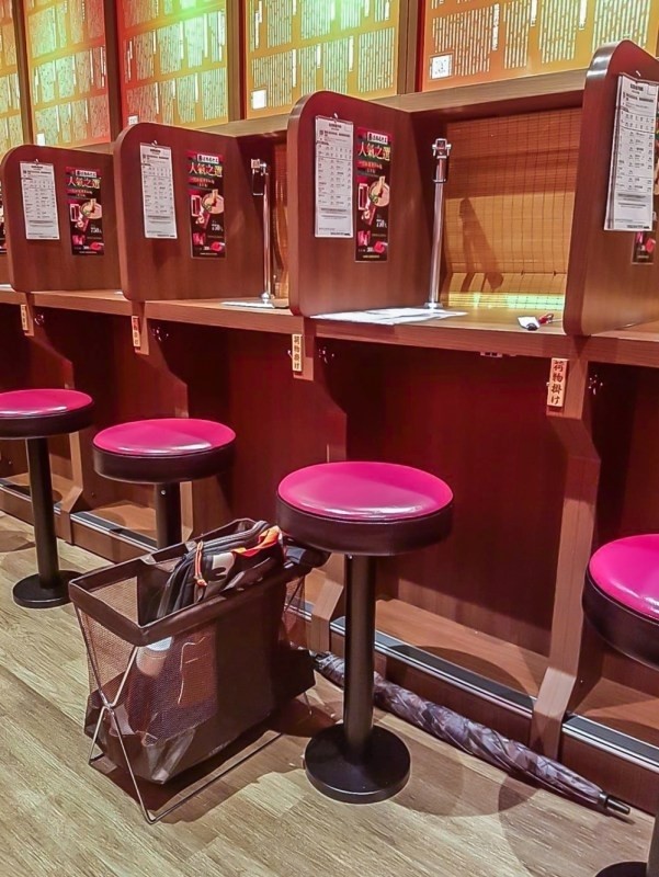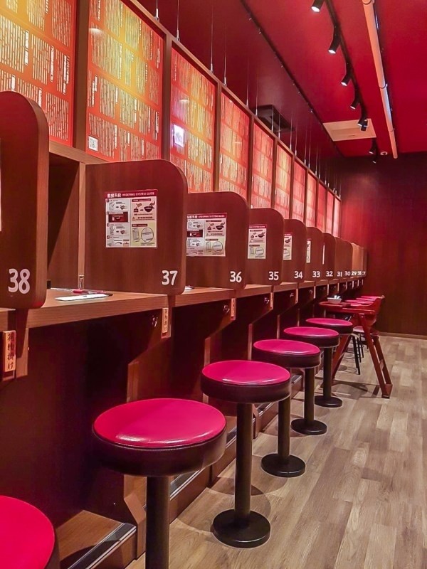 接下來,熊也跟大家分享ICHIRAN一蘭拉麵台灣台北本店的實景座位配置,每個座位的寬度大概就是一個人半張開雙手手肘的狀態,看似不大但並不會讓人覺得擁擠(但底下的座椅不能移動)