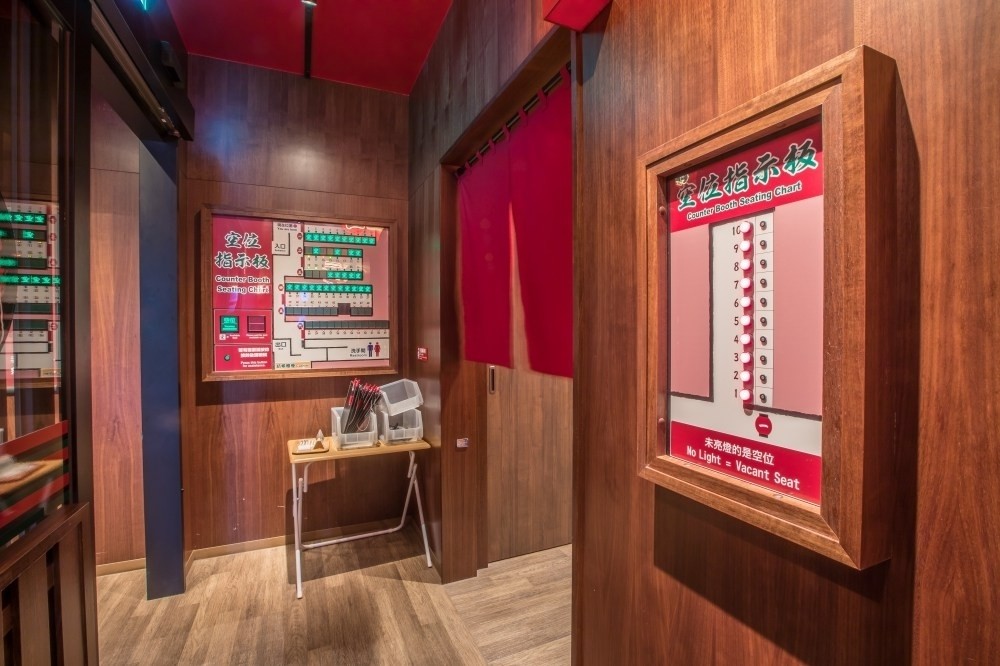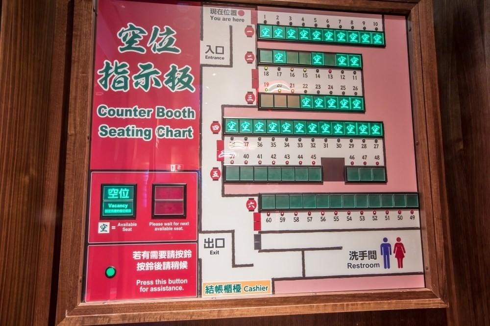 繼續往內走,就可以慢慢看見ICHIRAN一蘭拉麵台灣台北本店的空間與座位區,為了讓大家都能看到這裡的位置狀態,ICHIRAN一蘭拉麵也設計了獨家的位置指示板(全店一共有60個位置)