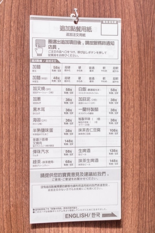 但如果一開始只點了拉麵,但後來才發現有些不足,嘿嘿,當然也不必擔心啊,這時候就輪到左邊牆壁的追加點餐用紙上場了,想吃什麼就寫下去,然後按服務鈴告訴服務人員即可!(但就會直接送加麵過來,而不會有鐵盤了)