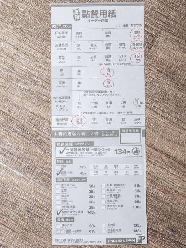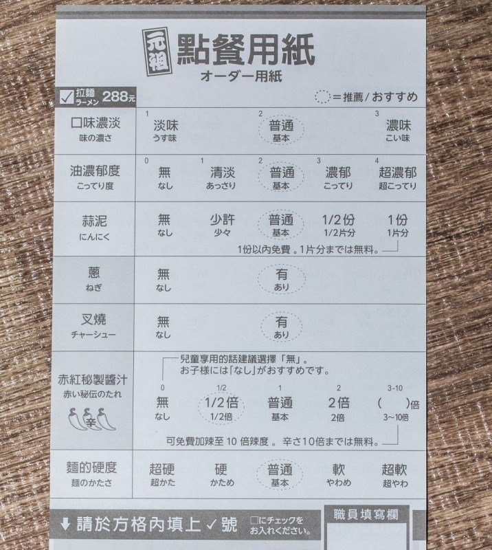 基本上這張紙可以分成上半部與下半部,上半部就是這一碗拉麵的所有配置,而下半部則是單點或是加點的配置,以熊的習慣而言(不管在日本或台灣都一樣),只要是拉麵,熊第一次都會品嚐最濃郁的狀態