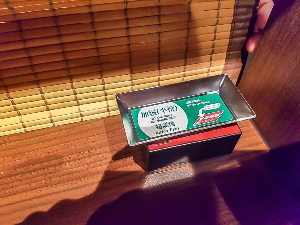 接下來,把半份加麵的鐵盤放上服務鈴,然後瞬間響起熟悉的音樂(這就是ICHIRAN一蘭拉麵的特色),接下來服務人員把鐵盤收走,就開始準備麵條了