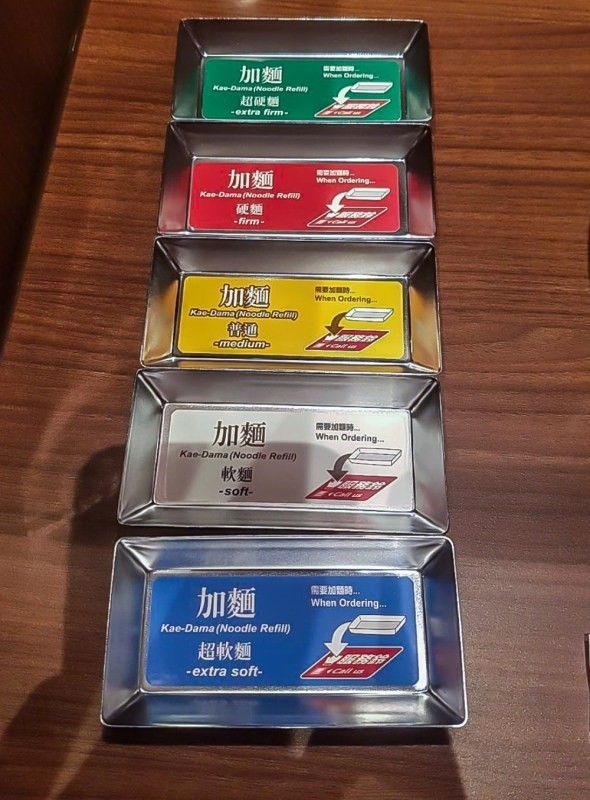 然後這一整排就是加麵的選擇與軟硬度(還記得一開始有一張元祖點餐用紙嗎?)如果你在那上面選了需要加麵的份量與硬度,服務人員就會在拉麵上桌時,一口氣再給你一個有不同標示的小鐵盤