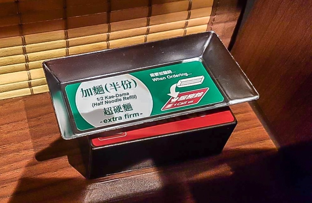 等到吃得差不多想要加麵時,就把小鐵盤放在服務鈴上面,就會響起一段音樂,服務人員就會過來把小鐵盤收走,然後送上半份加麵