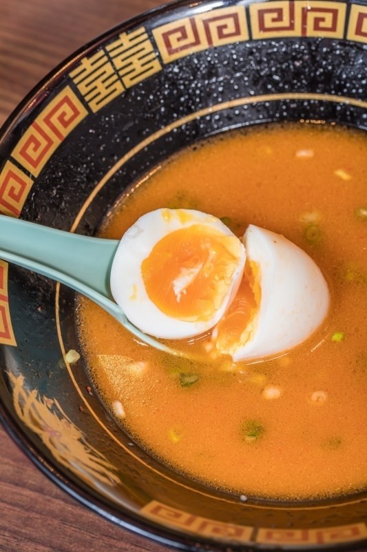 吃完了麵,熊的習慣才會把半熟蛋剪成一半放進湯裡,讓蛋黃跟濃湯混合在一起