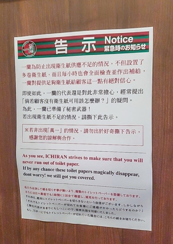 接著,熊還是跑去看了ICHIRAN一蘭拉麵的特色,就是洗手間的衛生紙配置,沒想到也是原汁原味,哈!