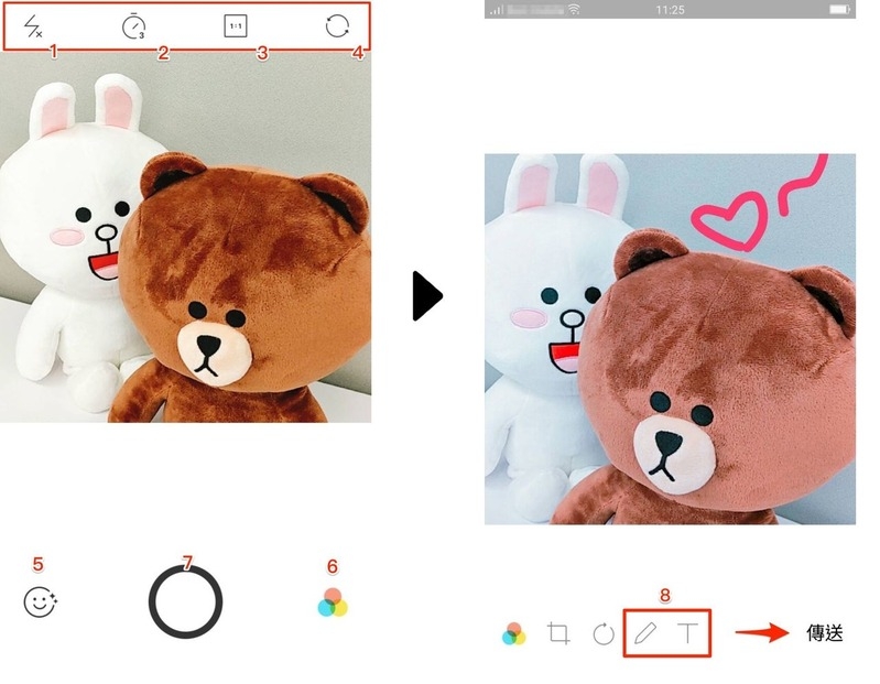 根據 LINE 官方的介紹, Android 用戶只要將 LINE 更新到 7.9.2 最新版本,就能在聊天室中開啟相機,並且看到更新後的相機介面以及依照自己喜好選擇閃光燈、倒數計時、相片比例、鏡頭翻轉、套用特效,與喜歡的濾鏡。然後就可以按下拍照或是錄影,影片拍攝後還能夠截取指定的部分或刪除聲音並且新增塗鴉或文字,再透過「傳送」就直接傳到當初開啟相機的聊天室中。