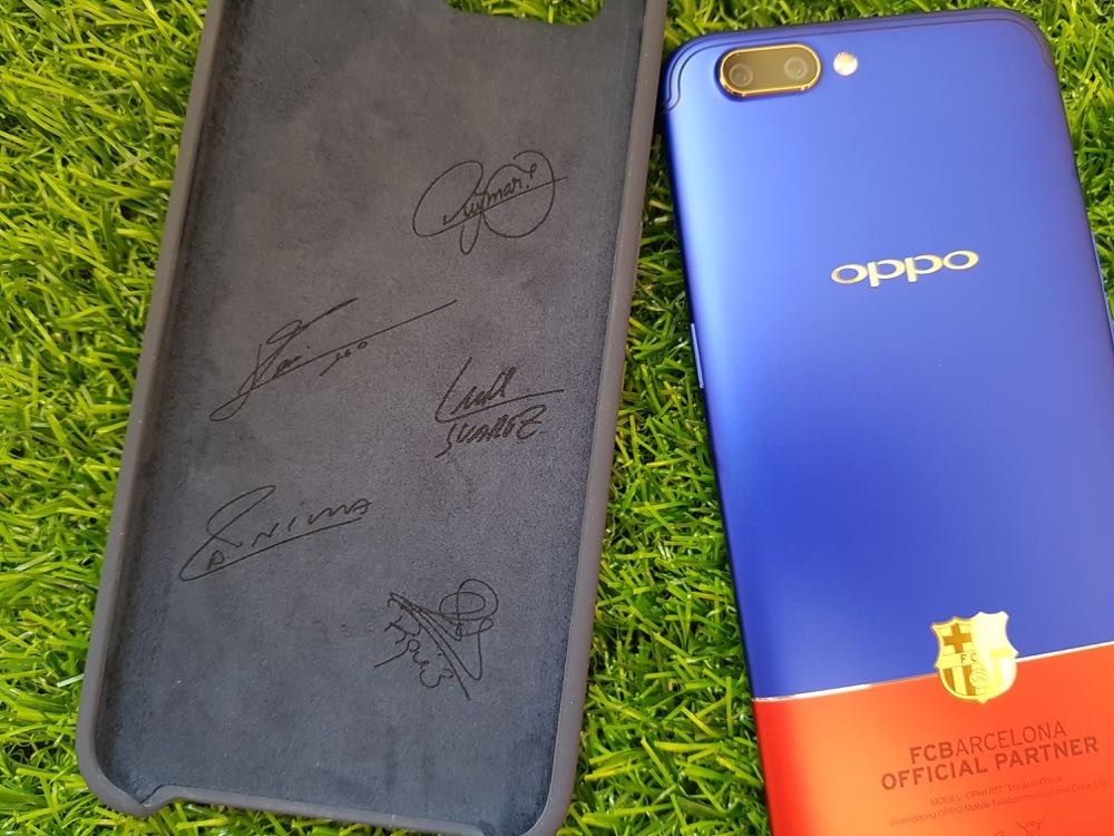 ▲ 最精緻的出現了!!!相當貼心的 OPPO 依舊為大家附上保護殼,不過這次附的竟然不只是同樣刻有 OPPO / 巴薩字樣的保護殼,竟然連裡面的麂皮設計處也附上了 Messi、Neymar、Suarez、Piqué 和 Iniesta 的簽名。