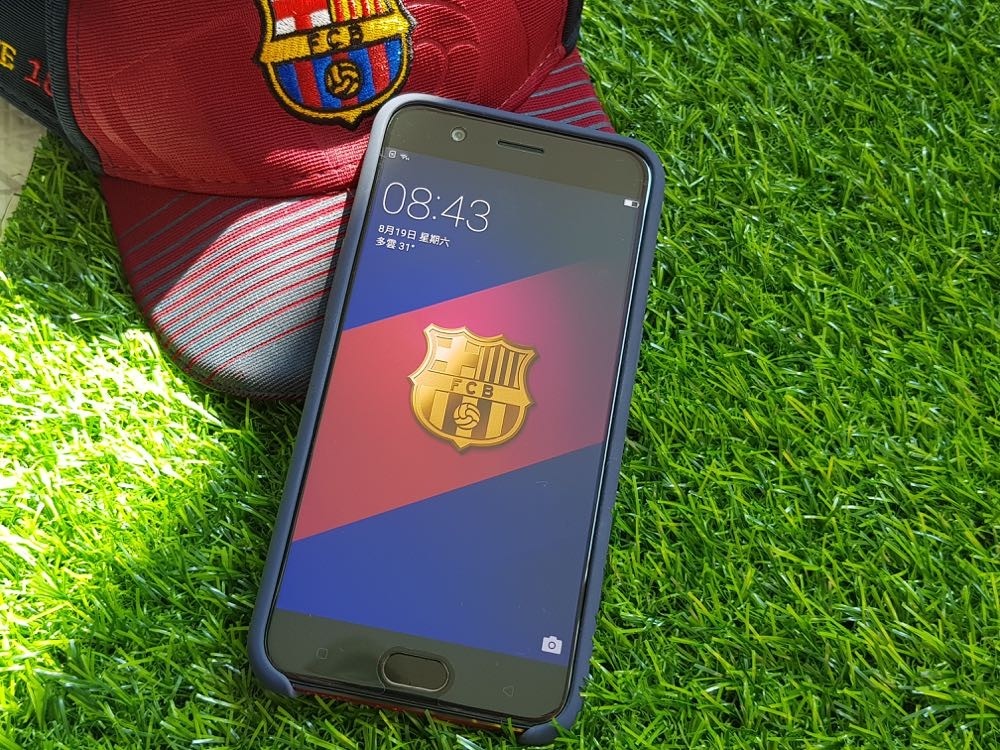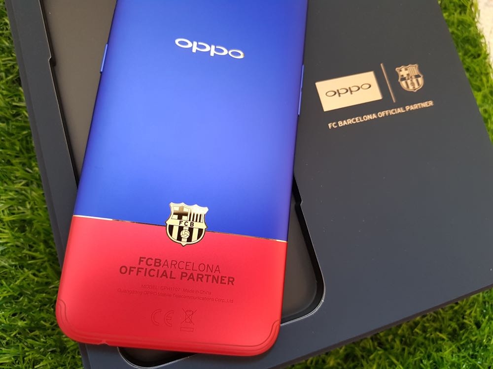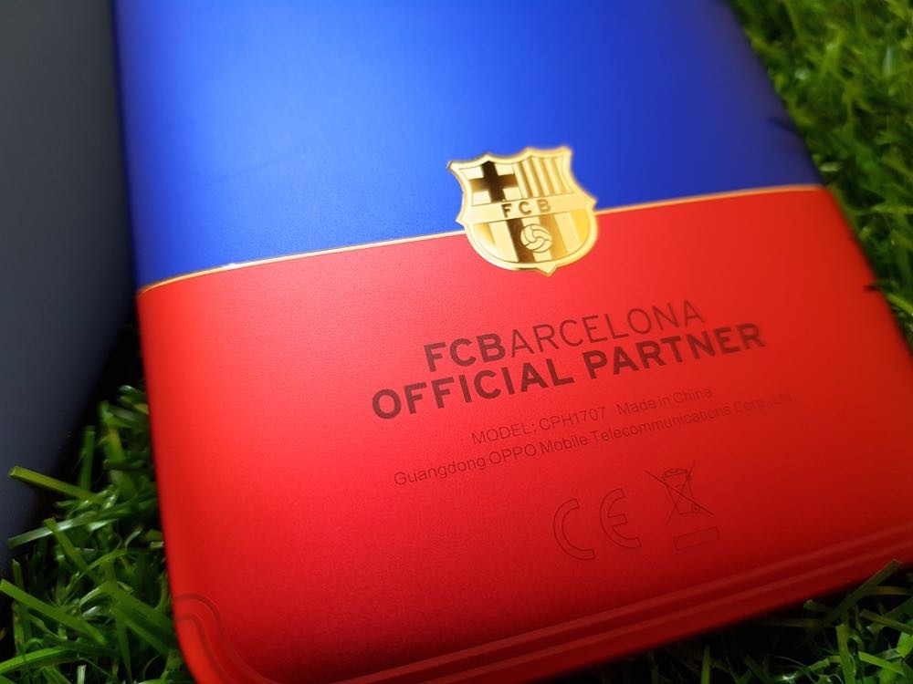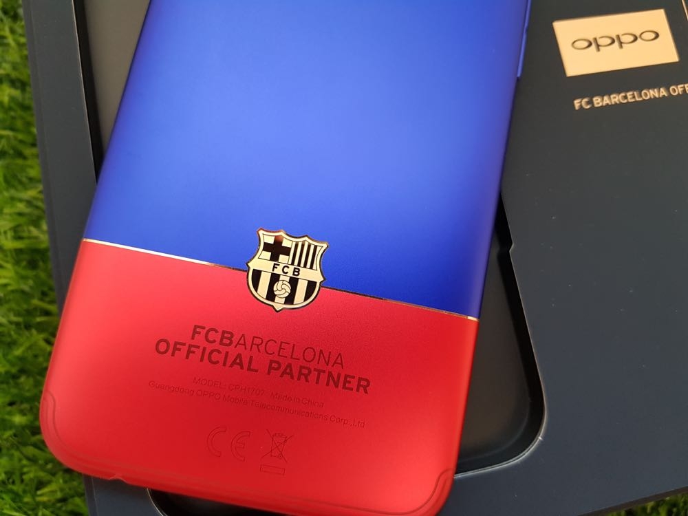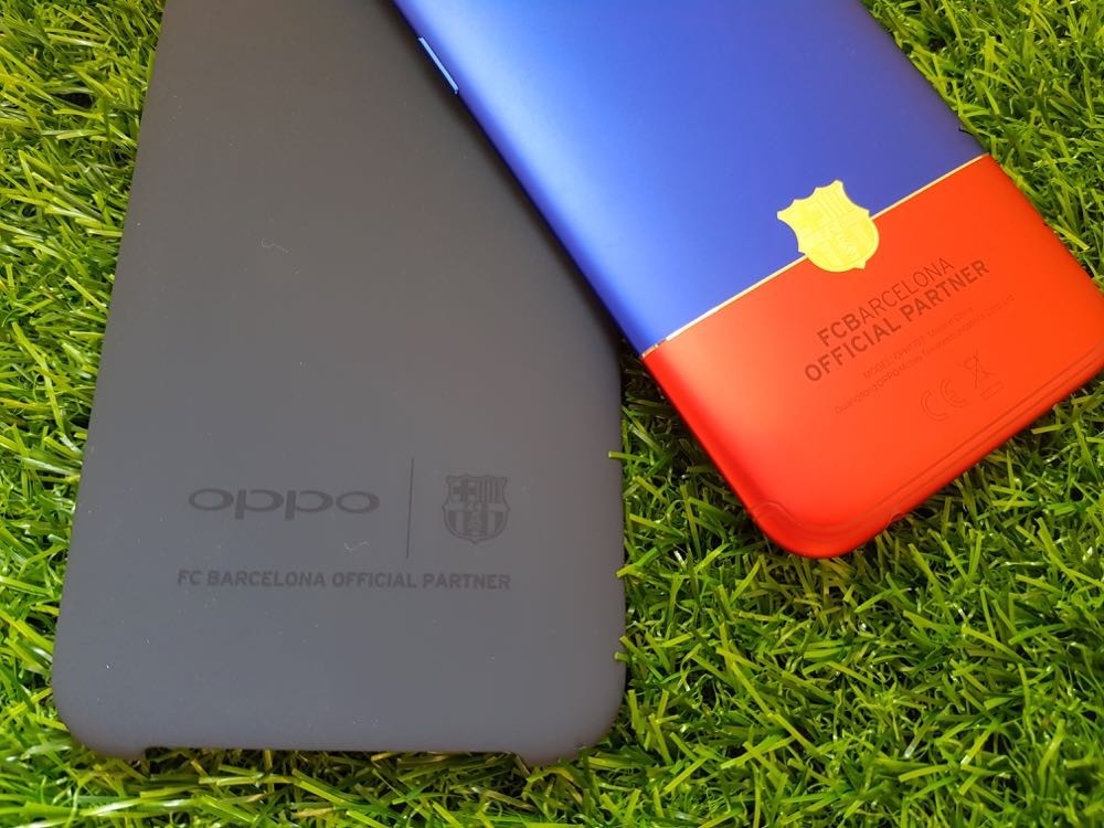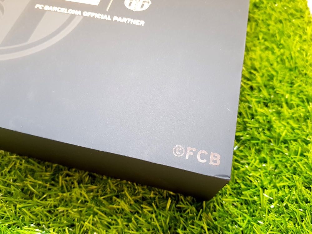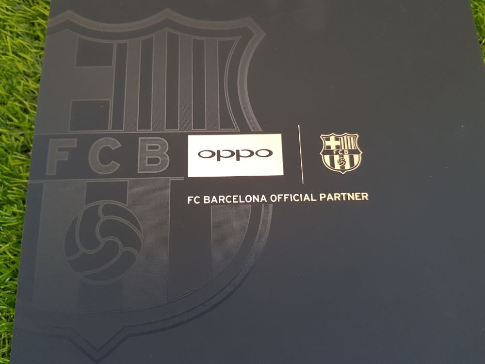 ▲ 在外盒上就能先感受到巴薩版本的精緻。不只中央有著金色的 OPPO 和巴薩隊徽,底部更藏著淺淺帶著微微突起的 FCB 隊徽當背景,以及右下方還藏著 FCB 字樣。