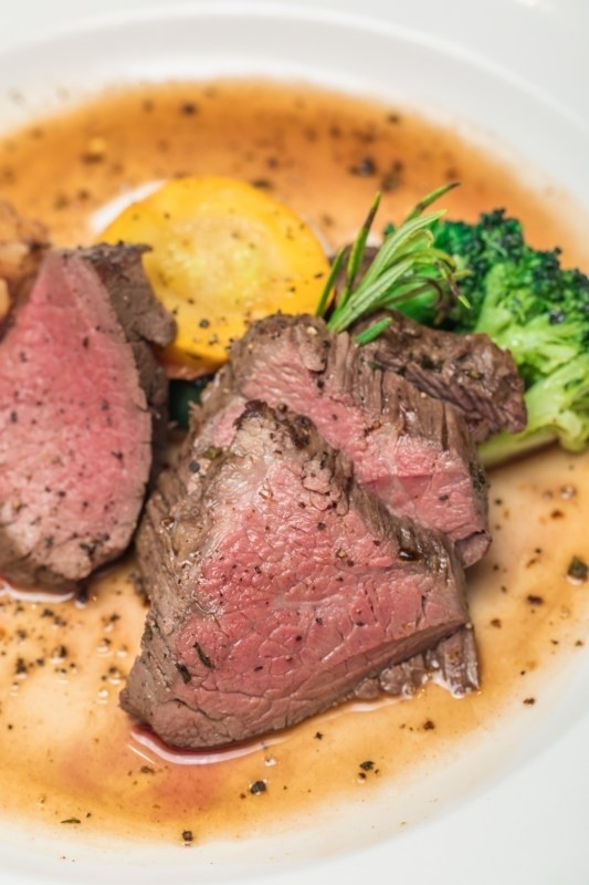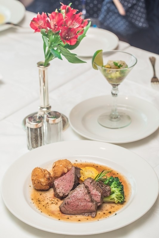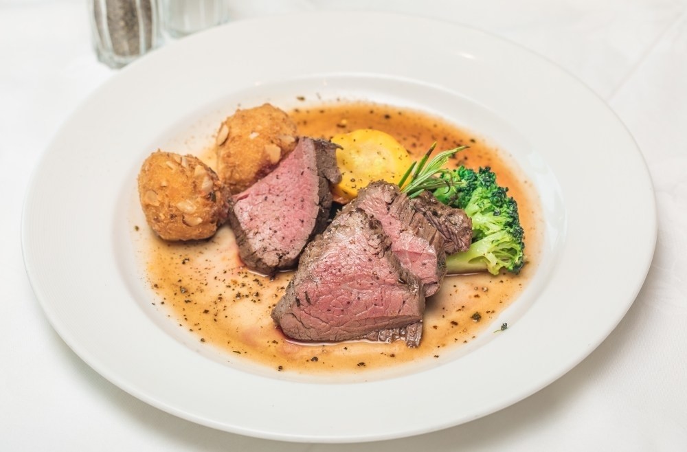 牛肉的熟度恰到好處,搭配濃中帶有清爽感的醬汁,搭配酥炸馬鈴薯球與蔬菜,的確是相當適合的搭配方式