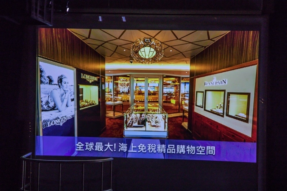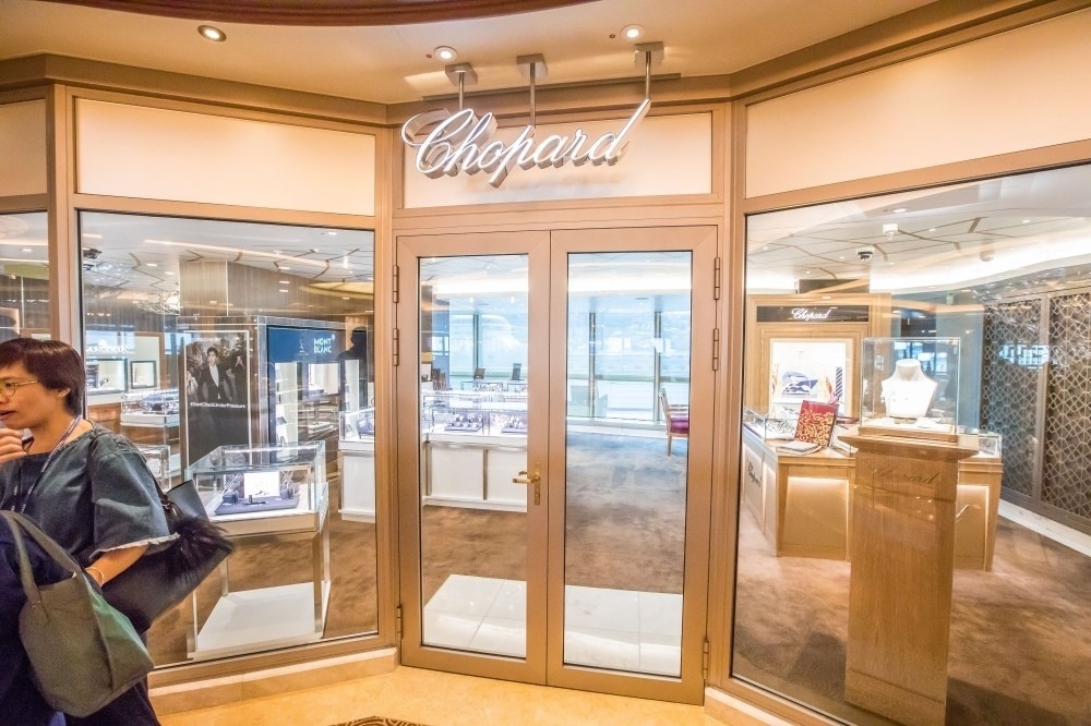 再來,因為盛世公主號還有接近1100平方公尺,也是海上最大的免稅精品空間,所以包括卡地亞、寶格麗、蕭邦等高級精品都能在這裡買到