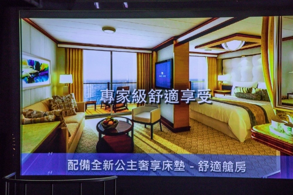 除了一開始說的,這艘盛世公主號有19層高,重量是14.3萬噸,而船身長達330公尺,完成之後光是升級配備跟服務就花了兩年(還有七億五千萬美金),在1780間房裡面,有八成的房間有私人陽台,再加上房間裡面有量身定做的全新公主奢享床墊,的確是誇張到不行