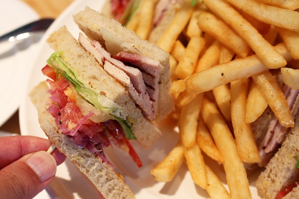 咬下第一口就覺得味道很豐富啊!雜糧吐司夾著燻雞肉和火腿,搭配蕃茄片和生菜,吃起來很有層次。