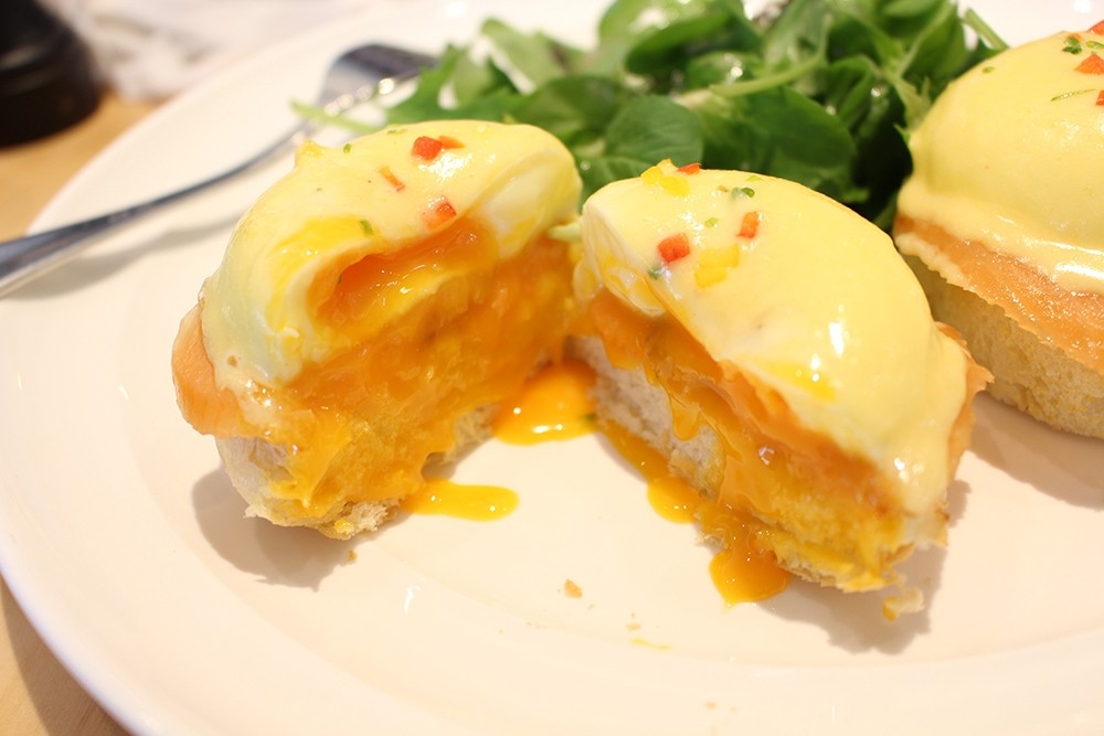 厲害的是切開時候的威力啊!太讓人揪心了,三分熟水波蛋液就這樣完美地流下來,搭配馬芬來吃實在太合拍了!
