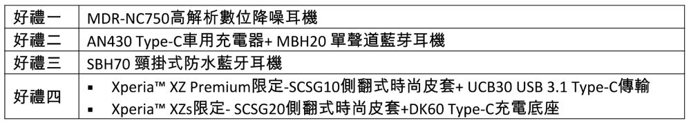 搭載全球首款 Motion Eye 相機模組的 Xperia XZs 與全球首款 4K HDR 影音娛樂超旗艦Xperia XZ Premium,今夏要讓消費者用最棒的螢幕、最棒的相機、最棒的音效科技,體驗全方位娛樂手機極緻魅力!接續 Sony Mobile 2017 年 Xperia 系列旗艦機超強買氣,Sony Mobile 加碼延長「夏日好禮祭 原廠好禮四選一」活動,第 2 彈於 106 年 8 月 1 日至 106 年 8 月 31 日展開,購買 Xperia XZs 或 Xperia XZ Premium,不分通路、單機或綁約購機皆可參加,於官方活動網站登錄購買憑證,即可享有高解析數位降噪耳機、 Type-C 車用充電器 + 單聲道藍牙耳機、最新加入的 SBH70 頸掛式防水藍牙耳機、時尚保護套 + Type-C 傳輸線 (Xperia XZ Premium) 或時尚保護套 + Type-C 充電座 (Xperia XZs) 等精美好禮四選一,每一款價值皆超過 NT$2,000 元以上,數量有限送完為止,不要錯過 Sony Mobile 準備的專屬夏日好禮完美入袋!