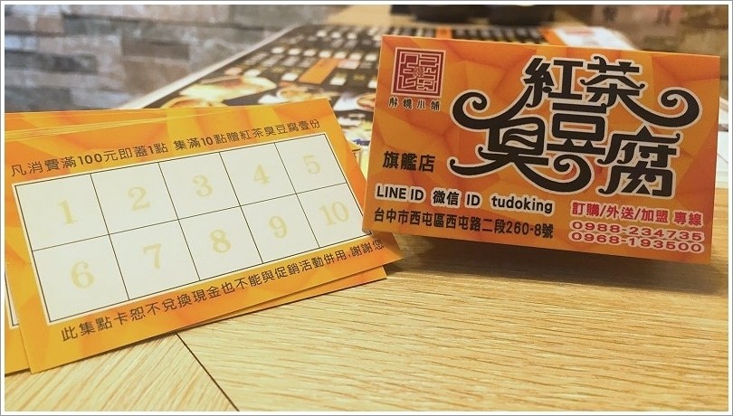 ▼店家還有特別設計集點活動,消費滿100元即可蓋一點,集滿十點就能獲得紅茶臭豆腐一份,真的是相當划算!如需外送也沒問題,只要滿300元即可外送,不管是用電話或是加LINE訂購都ok,一整個超方便的啦!(詳細活動內容以店家公告為主)