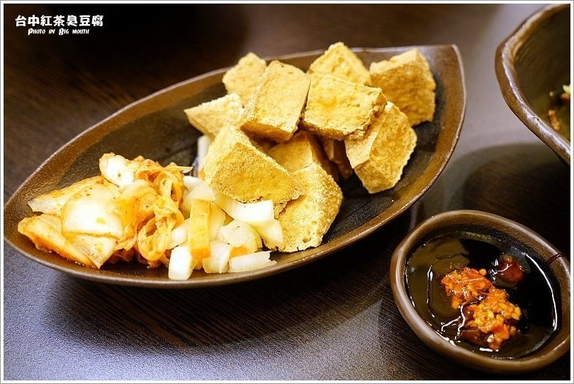 ▼紅茶臭豆腐(60元),一旁附有泡菜、醃蘿蔔及特製醬料,都是店家自行研發製作的唷!紅茶臭豆腐除了沾附醬料享用之外,也可以搭配一旁的泡菜、醃蘿蔔一起吃,不僅清爽順口又解膩,風味更獨特多元!