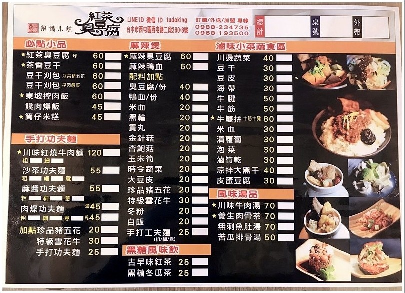 ▼MENU,現在除了有紅茶臭豆腐之外,還有其他茶香豆干相關餐點、米食類、手打功夫麵、麻辣燙、滷味小菜、湯品、風味飲品等,選擇還不少!