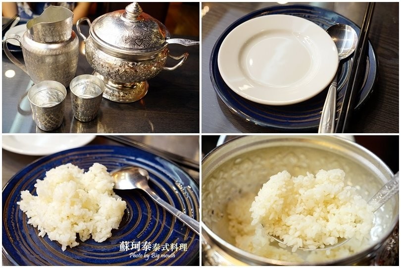 ▼桌上已經擺好餐具、餐盤與錫杯,另外還會送上檸檬水,如果有單點白飯(20/人,內用無限供應)的話也是用錫製的容器盛裝,感覺一整個相當泰式啊!這裡的餐盤有一大一小,大的是裝白飯使用,小的可以裝一些配菜或是蝦殼等,都可以視個人習慣自由運用!不過他們家的白飯因為考量到長輩跟小孩牙口不好的問題,所以特別選用台灣在地的壽司米,不過重點是他們的菜色都很下飯,所以還是很ok啦!