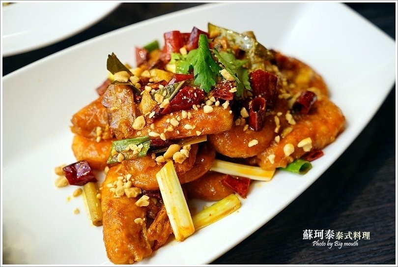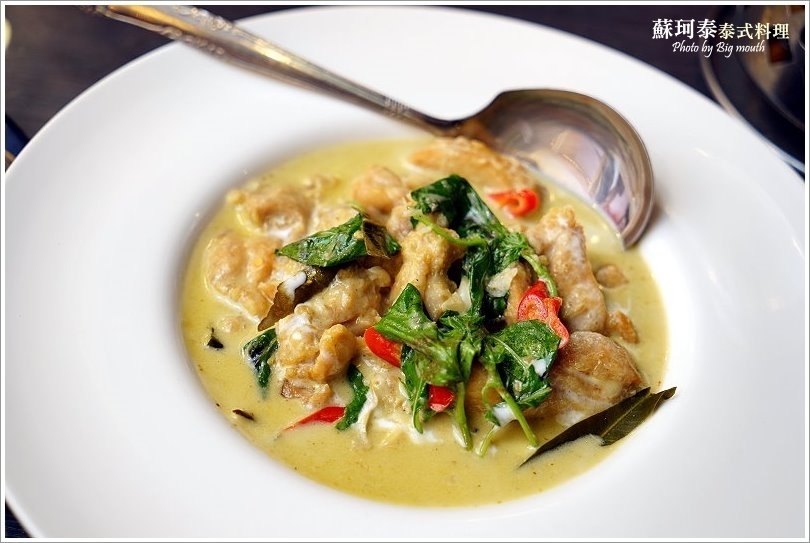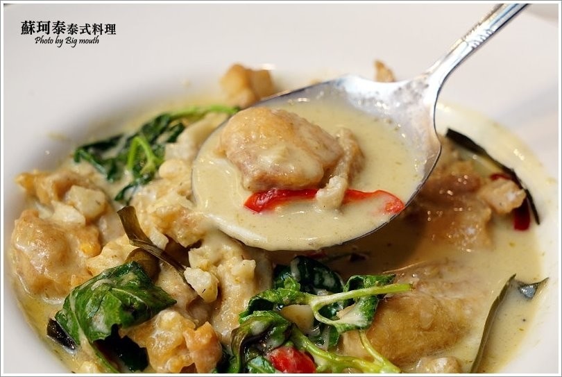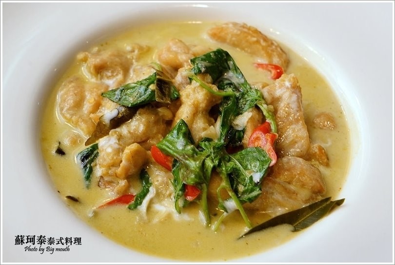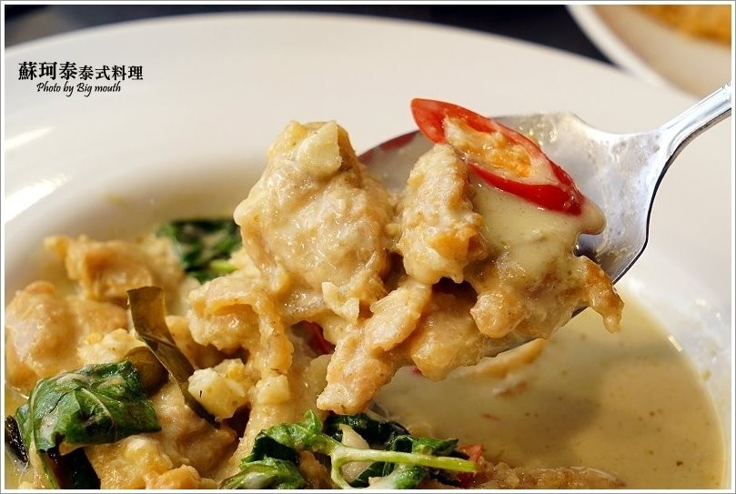 ▼他們特別嚴選雞腿肉,採用蛋液醃漬過後裹上一層薄粉再油炸,最後再跟綠咖哩椰汁醬、九層塔、辣椒、檸檬葉等配料一起拌炒!