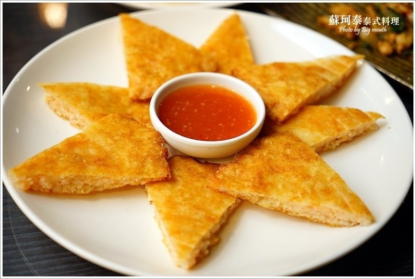 ▼厚切月亮蝦餅(320元),中間搭配的是自行調製的酸甜醬汁!