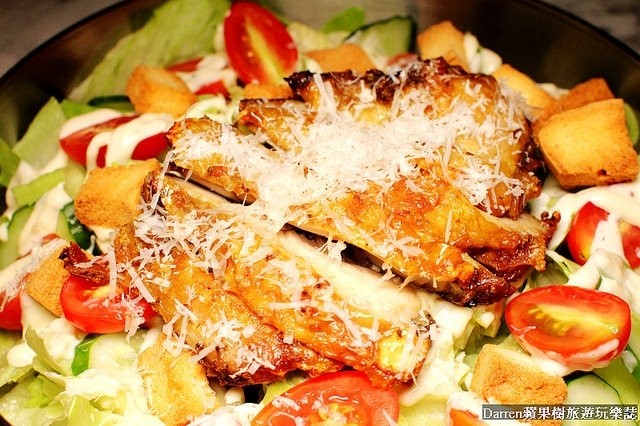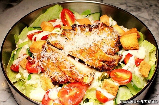 最上面還放上一大塊烤雞,烤雞切片撒上起司粉,雞肉片肉質柔嫩加上外皮烤到微脆,配上沙拉輕爽開胃