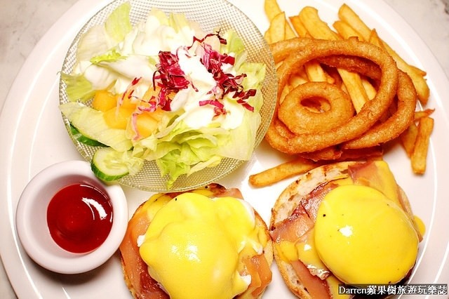 大西洋班尼迪克蛋香濃滑順是店內很受歡迎的人氣早午餐,搭配附餐的沙拉、薯條和洋蔥圈很有飽足感