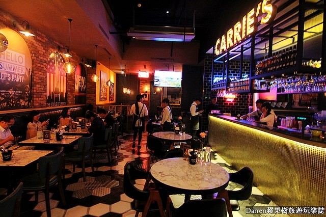 CARRIE’S霓虹燈管加上絢麗的吧台,以及美式復古海報和黑白地磚,營造出浪漫時尚的用餐空間