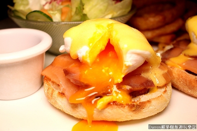 身為班尼迪克蛋的配角淡黃色荷蘭醬口感豐厚加分,加上煙燻鮭魚和火腿的鹹香,以及烤過的英式馬芬