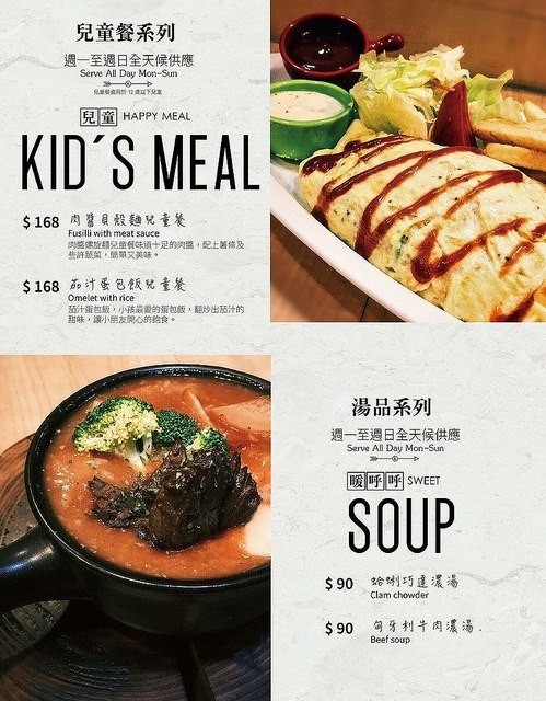餐點選擇多樣化從全天早午餐、下午茶、漢堡、義大利麵、焗飯、排餐、甜點、奶昔、冰沙、咖啡、啤酒等